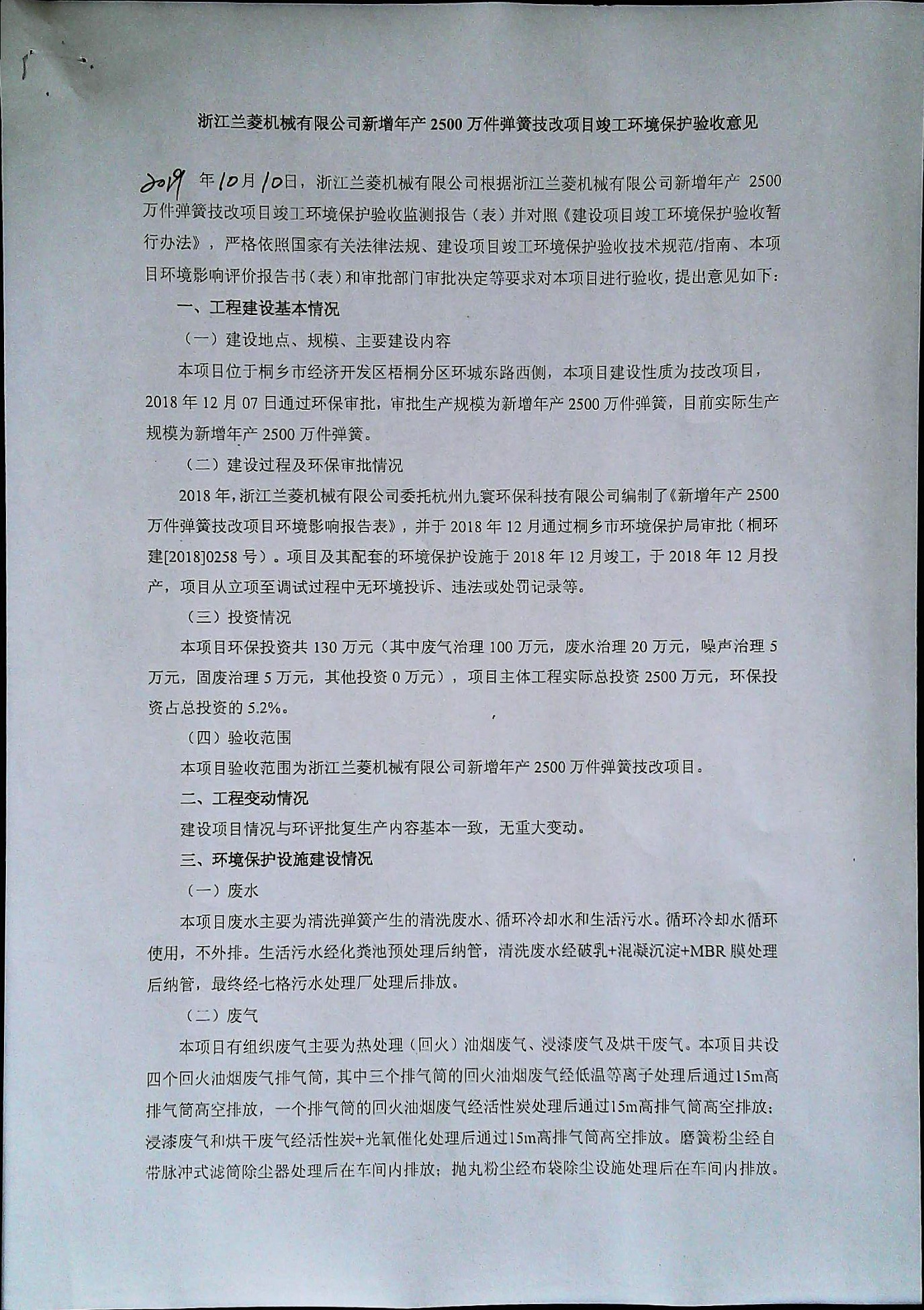 • 浙江蘭菱機械有限公司新增年產2500萬件彈簧技改項目竣工環境保護驗收意見